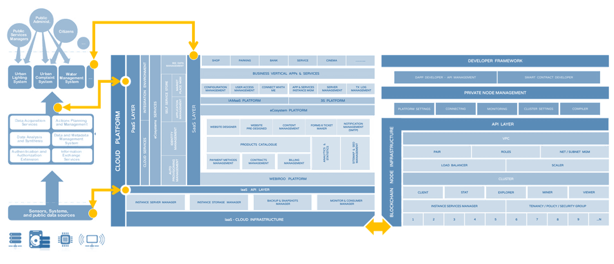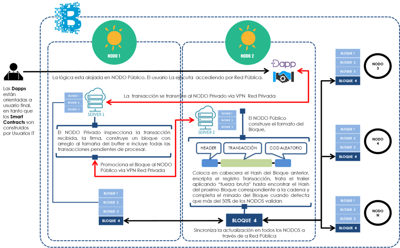 La Plataforma brinda la posibilidad de crear y gestionar Infraestructuras Propias y desplegar aplicaciones distribuidas que permitan ejecutar transacciones dependientes de reglas inteligentes, puesto que, para el tipo de explotación y óptima aplicación del Modelo BlockChain en nuestro ámbito, el punto focal es la gestión y control de NODOS