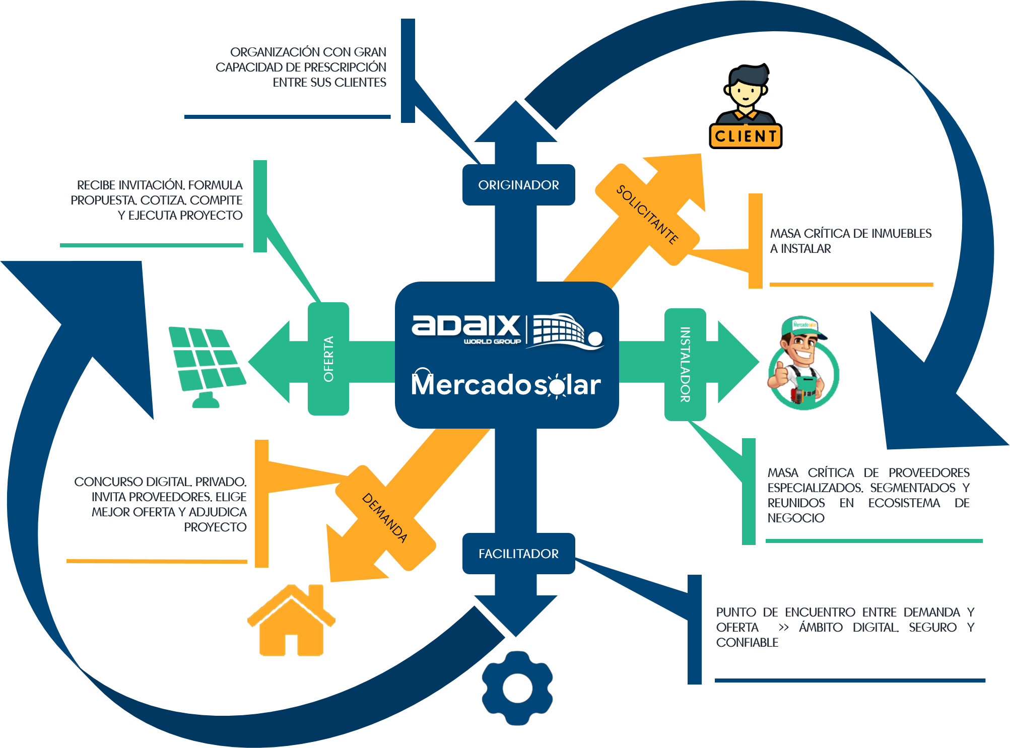 Nuestra Propuesta de Valor dirigida a ADAIX WORLD GROUP, radica en el ofrecimiento de desarrollar conjuntamente un modelo colaborativo y sinérgico, donde ADAIX se constituya en NODO ORIGINADOR de Solicitudes Bid&Ask en MercadoSolar